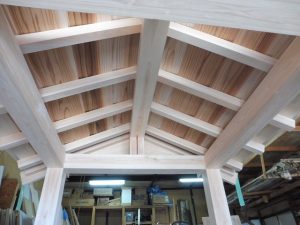 今回は祠を納める現場の事情で工場で組み上げます。祠の建て方を終え、